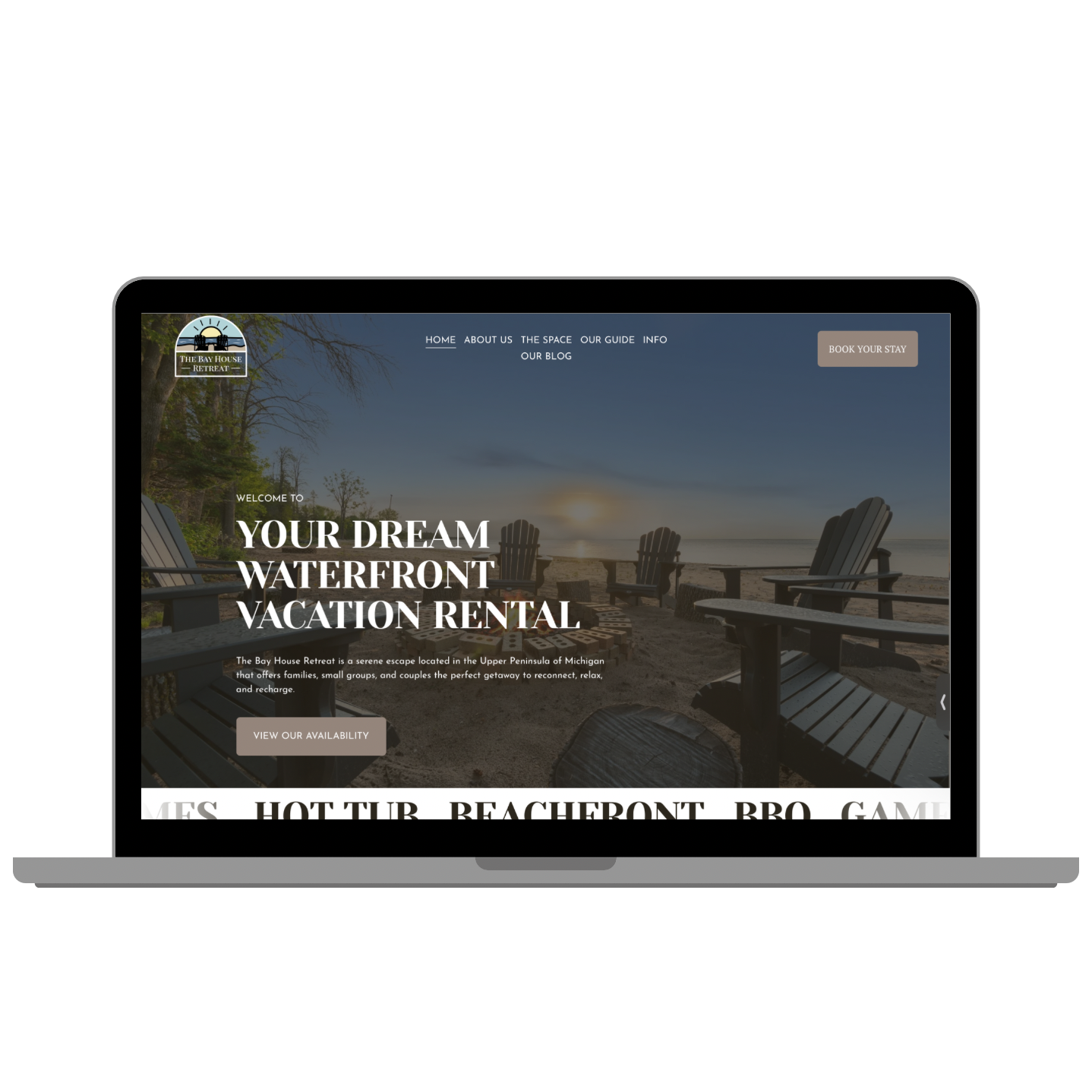 The Bay House Retreat is a waterfront vacation rental in Menominee, Michigan, founded and operated by Mikayla and Austin Vieth. This project was built from the ground up as a fully branded short-term rental designed to attract direct bookings and reduce reliance on OTA platforms. From naming and brand identity to website development, social media strategy, and custom guest-facing materials, every element was intentionally created to support long-term growth and ownership.